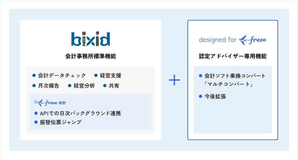 今回freee認定アドバイザー向けにAPI連携の拡張機能として「bixid designed for freee」の提供を開始し、第一弾として、freee会計の利用を開始するユーザー様が、従前から使用している会計ソフトの情報資産を残し、再活用できるシステム「マルチコンバートサービス」の提供をします。