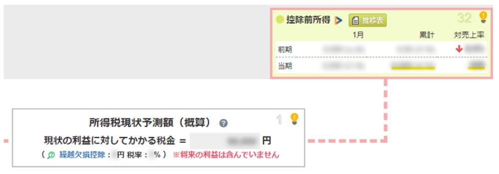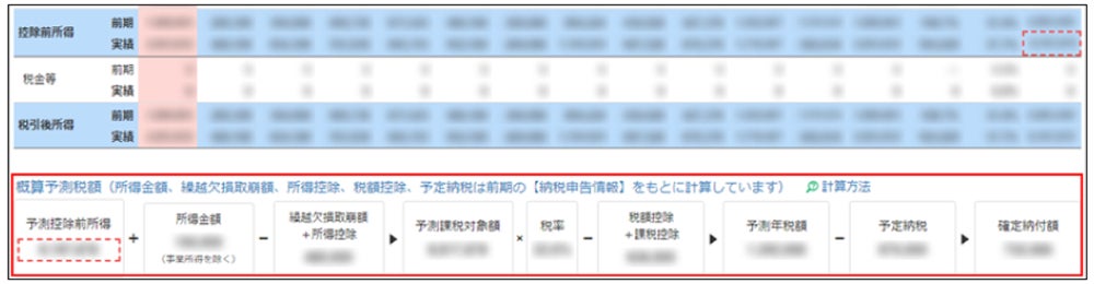 前期の納税申告情報とその時点の利益額をもとに、今期の概算の所得税予測額を算出できます。