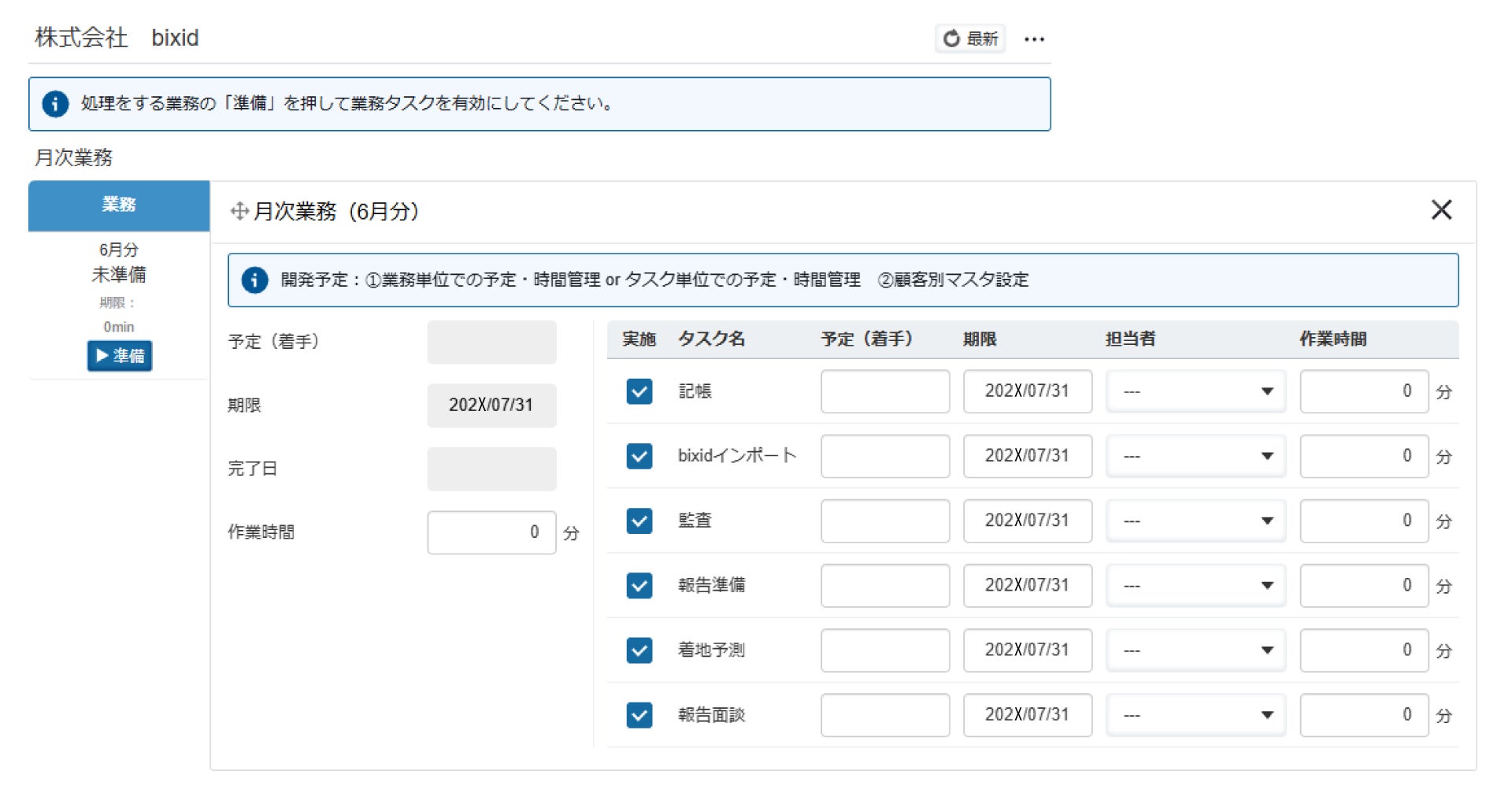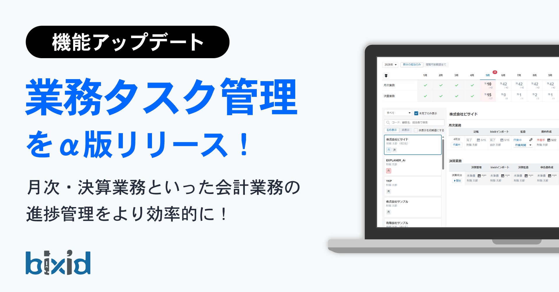 株式会社YKプランニング(本社:山口県防府市、代表取締役社長:岡本辰徳)は、経営支援クラウド「bixid(ビサイド)」の会計事務所ユーザー向け機能である統合管理サービスにおいて、日々の業務進捗を管理可能な「業務タスク管理」機能のα版(評価版)をリリースいたしましたのでお知らせいたします。
