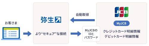 弥生は、2018年よりJCBカードとのAPI連携を開始し※1、弥生の提供する会計ラインアップ (デスクトップソフトおよびクラウドサービス) との自動連携を行ってまいりました。今回、自動連携の対象カードに法人向けJCBデビットカードを追加し、法人向けJCBデビットカードを利用中のユーザーも各種会計処理の自動仕訳をご利用いただけるようになりました。