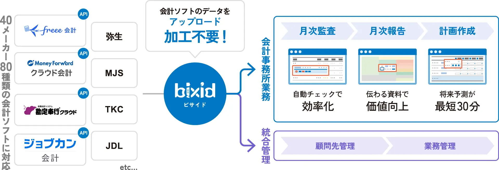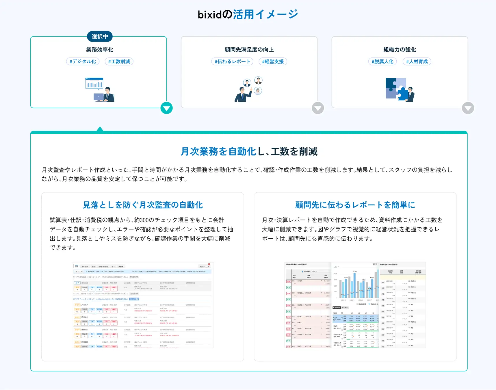 従来の全体像は機能を中心とした構成でしたが、本リニューアルでは会計事務所の業務の流れに沿ってbixidの全体像を再設計しました。月次監査・月次報告・計画作成といった業務単位で活用方法と価値を整理することで、「何ができるか」だけでなく「どのように業務に活かせるか」が直感的に理解できる構成へと刷新しています。