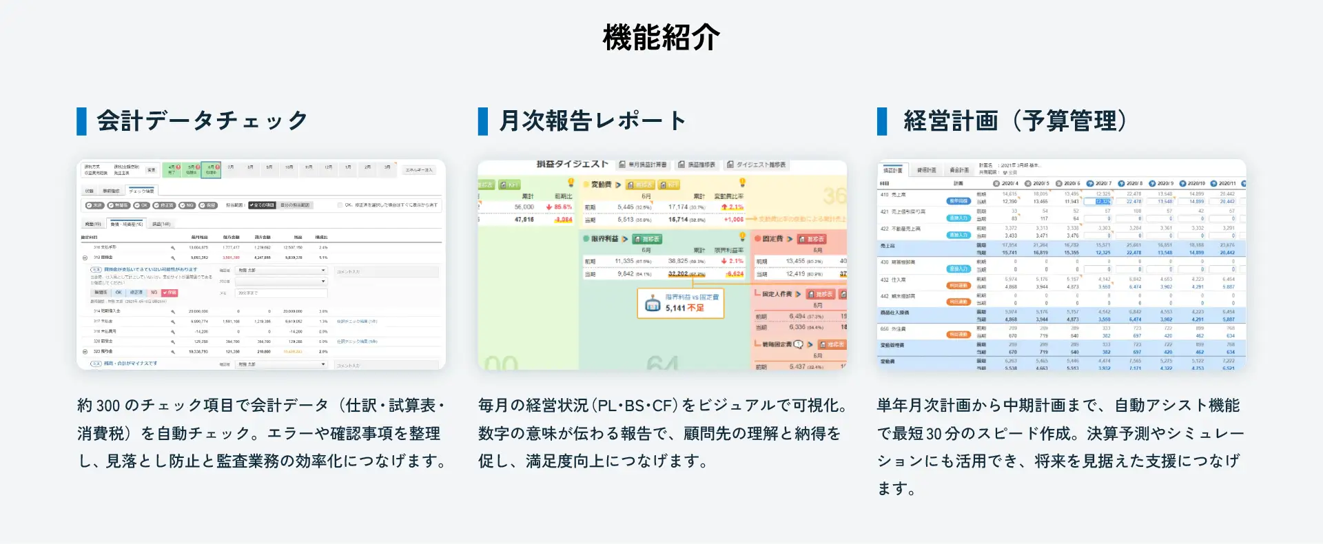 会計データチェック、月次報告レポート、経営計画などの主要機能について、会計事務所の業務とのつながりを意識して整理しています。「どの業務で」「どのように活用されるか」を軸に構成することで、監査業務の効率化や月次報告の価値向上、経営支援の高度化といった活用イメージを具体的に伝えています。